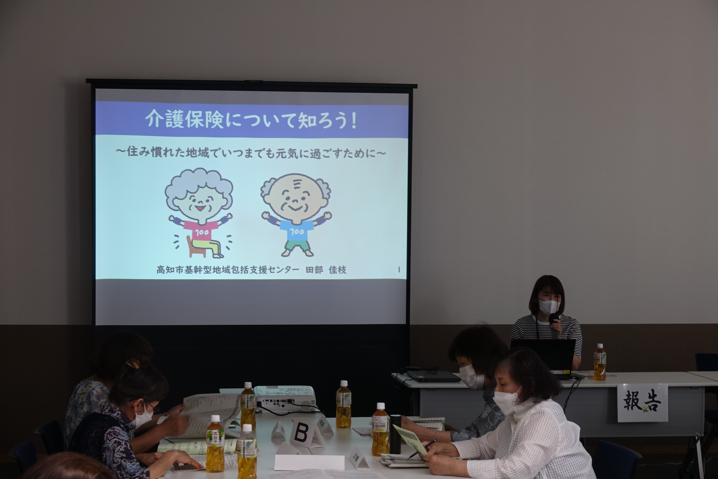 24名の組合員さんの参加のもと、佐竹一夫こうち生協理事長による開会の挨拶に始まり、議案提案と承認が行われ、高知市基幹型地域包括支援センターの担当係長で保健師の、田部佳枝氏による「介護保険サービスと高齢者施設について」の講演を聞きました。