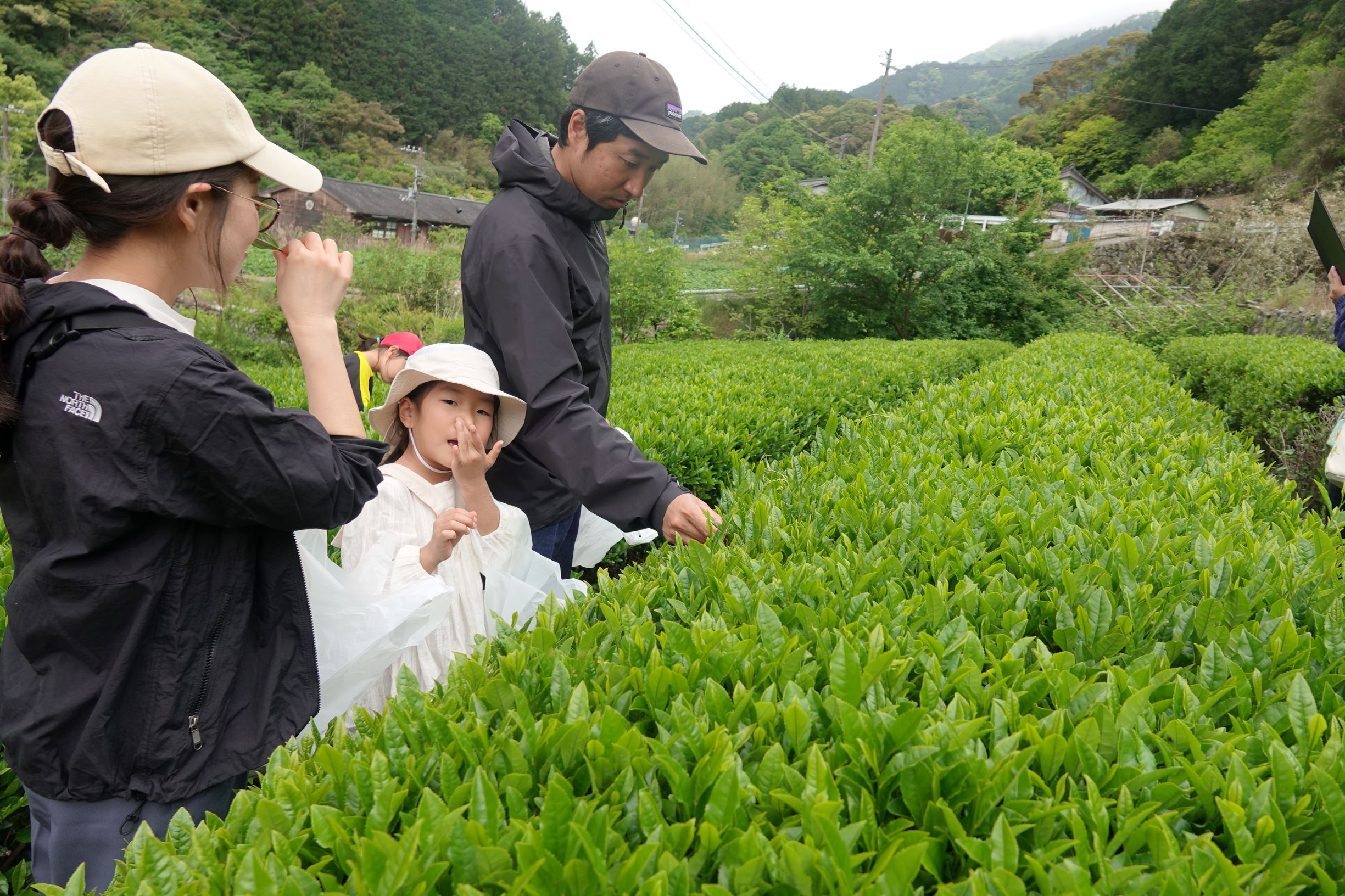 「お茶の匂いがする!」「え、しない…。」という会話が聞こえてきたり、子どもたちも大人も多くの方が初めてのお茶摘みで、楽しい!というお声も聞こえました。摘み取るお茶の葉はやわらかく、簡単に摘むことができて、集中して作業をするとあっという間に時間が過ぎていきました。