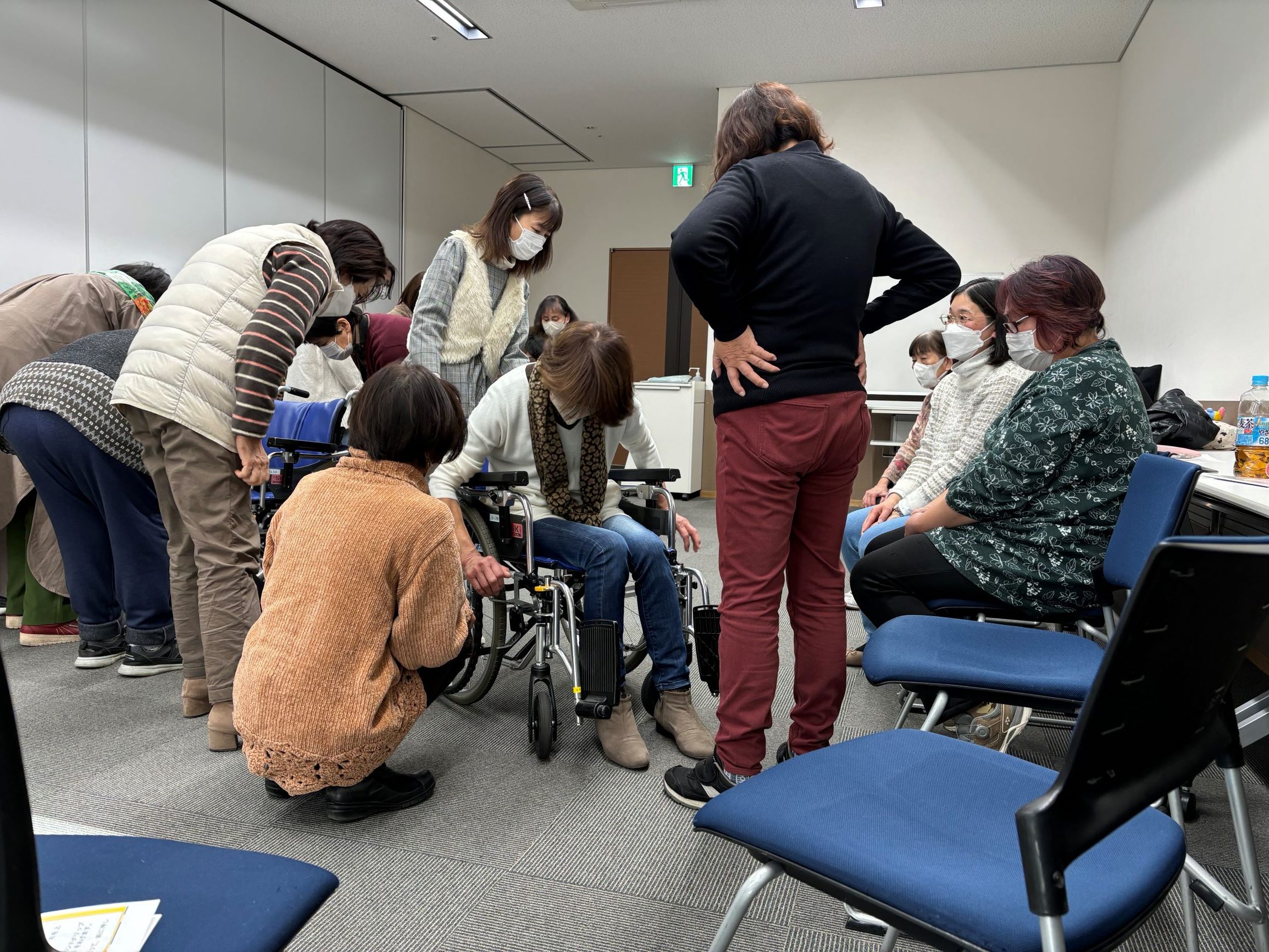 初めに近森病院リハビリテーション部作業療法科作業療法士 森永哲氏を講師にお招きし、車椅子の押し方、段差の越え方、スロープ時の車椅子の押し方等をご指導いただきました。参加者全員が車椅子に乗って触って体験することで、より理解を深めることができたようです。