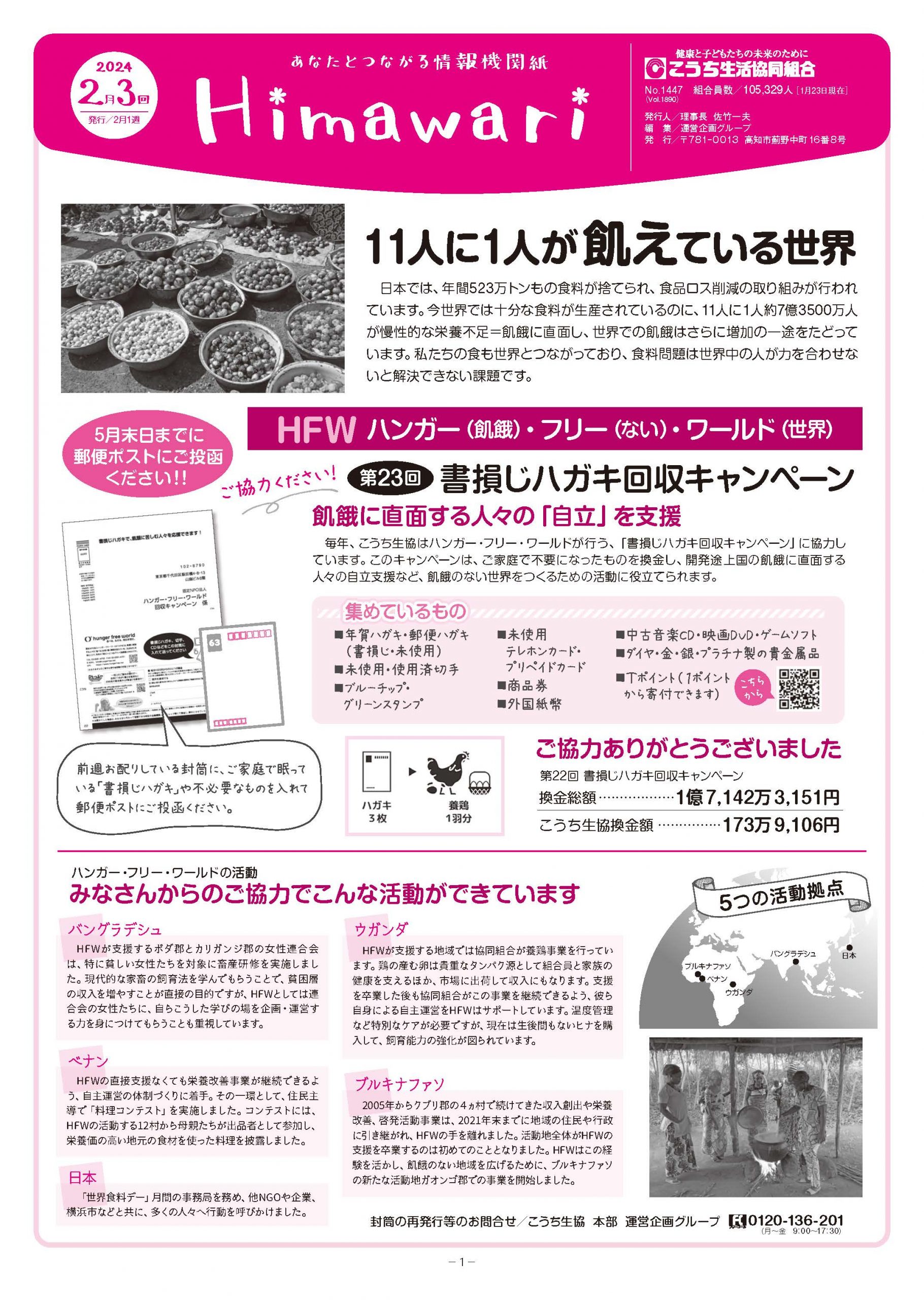 毎年、こうち生協はハンガー・フリー・ワールドが行う、「書損じハガキ回収キャンペーン」に協力しています。このキャンペーンは、ご家庭で不要になったものを換金し、開発途上国の飢餓に直面する人々の自立支援など、飢餓のない世界をつくるための活動に役立てられます。