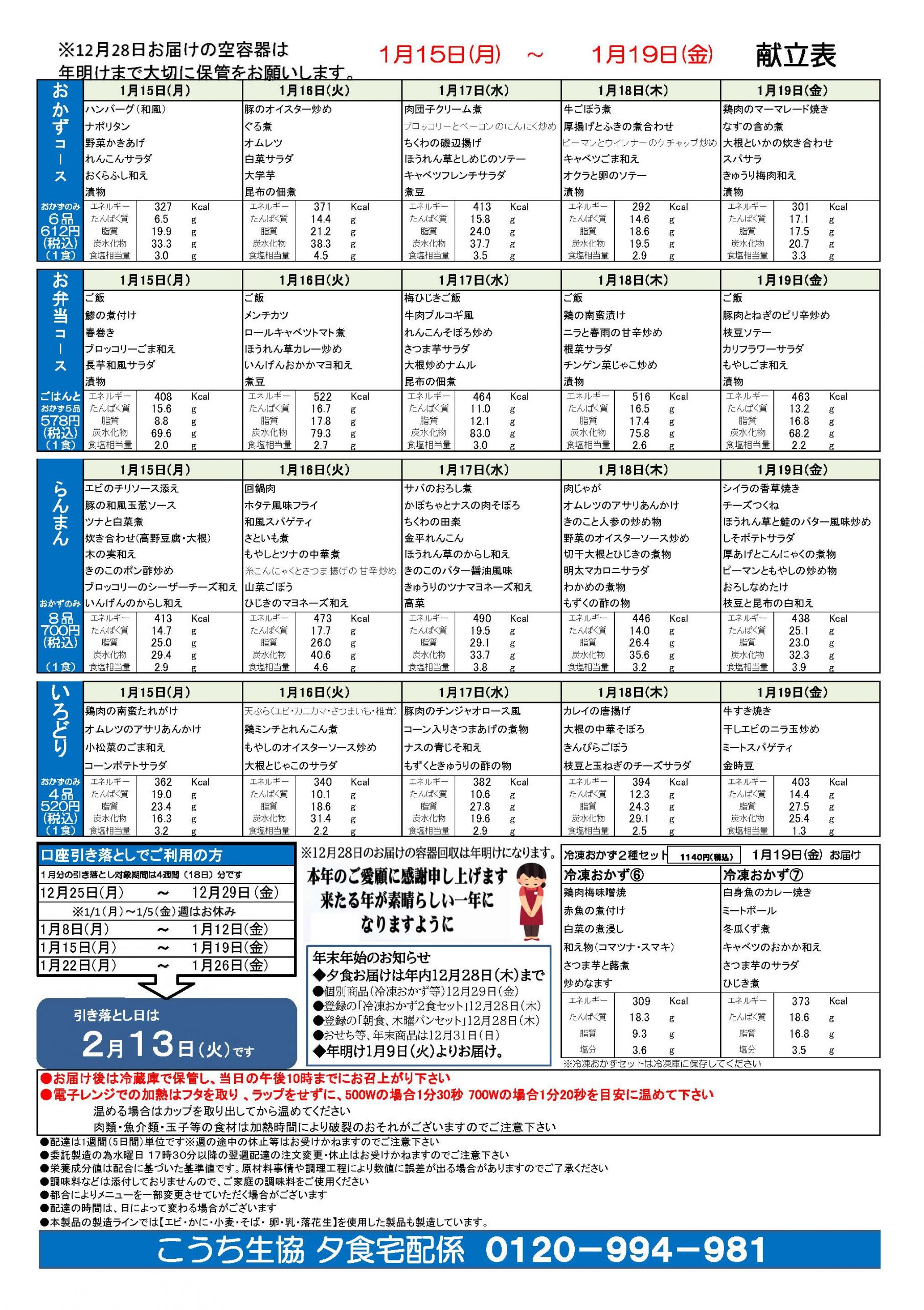 夕食宅配メニュー表(1月15日~1月19日)2023.12.26