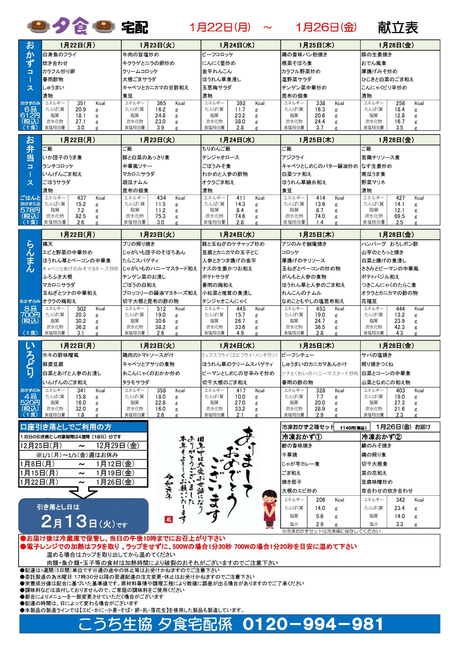 夕食宅配メニュー表(1月22日~1月26日)2024.01.11