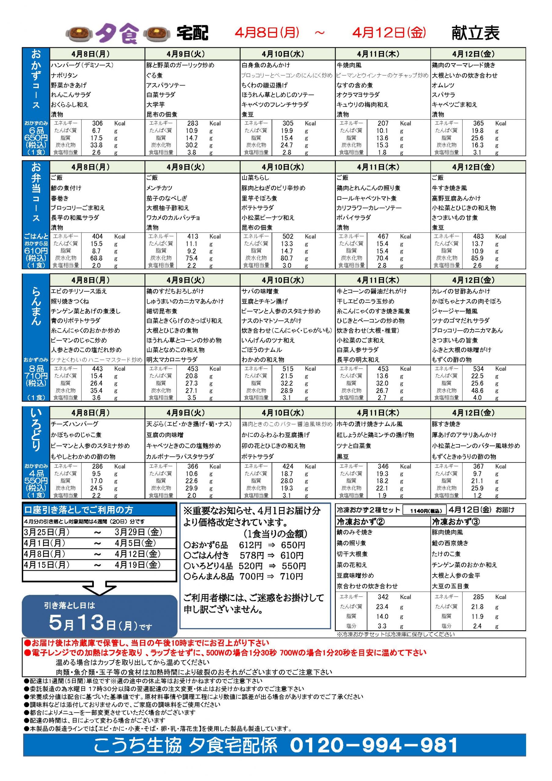 夕食宅配メニュー表(4月8日~4月12日)2024.03.28