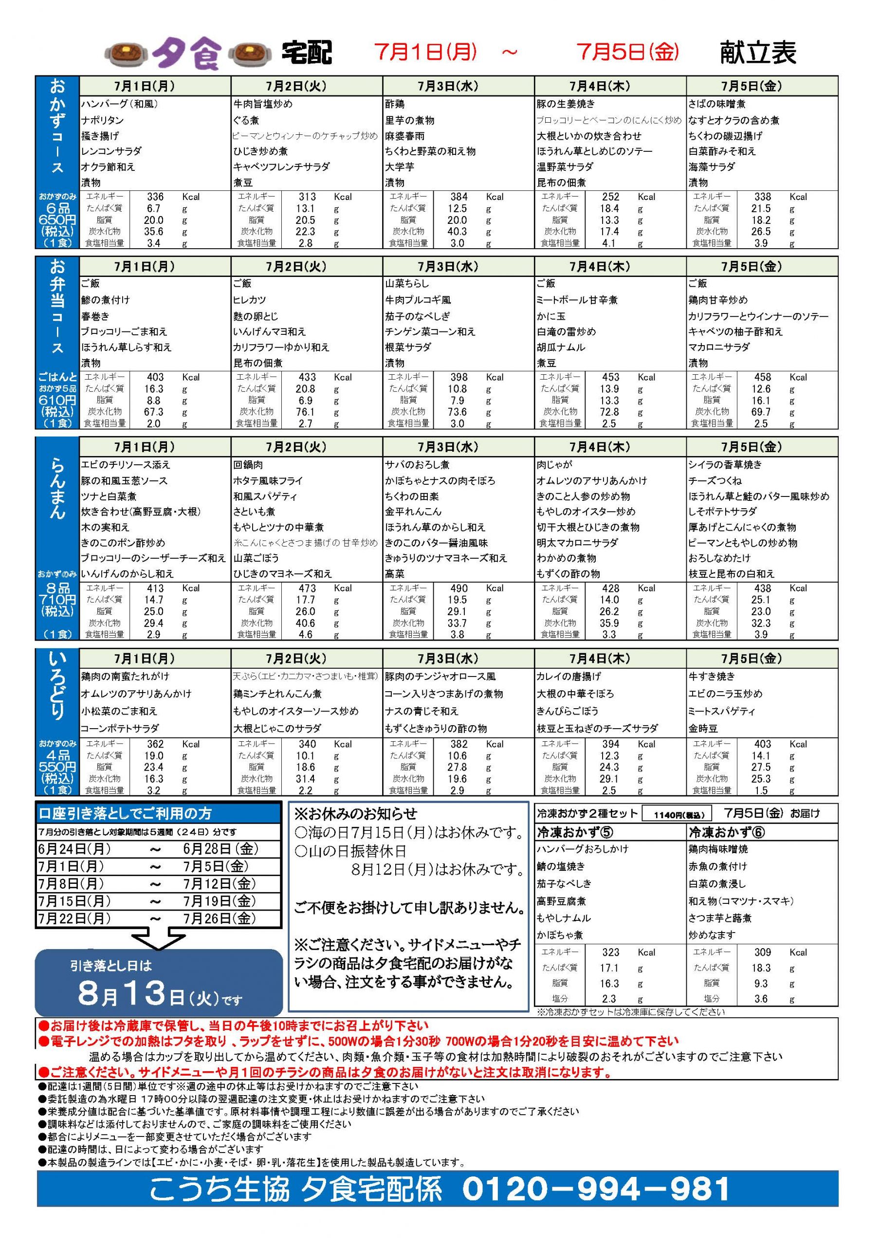 夕食宅配メニュー表(7月1日~7月5日)2024.06.19