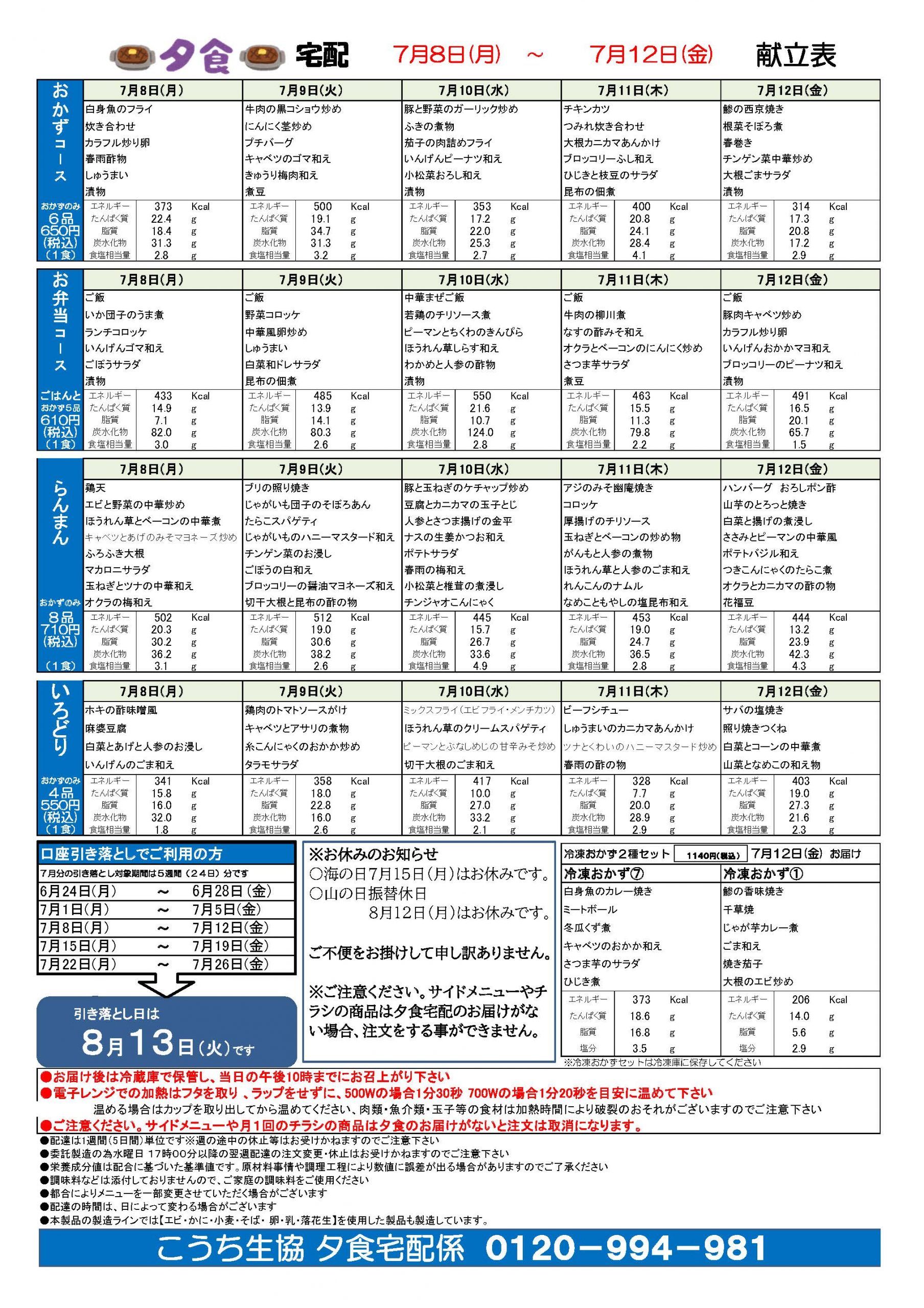 夕食宅配メニュー表(7月8日~7月12日)2024.06.26