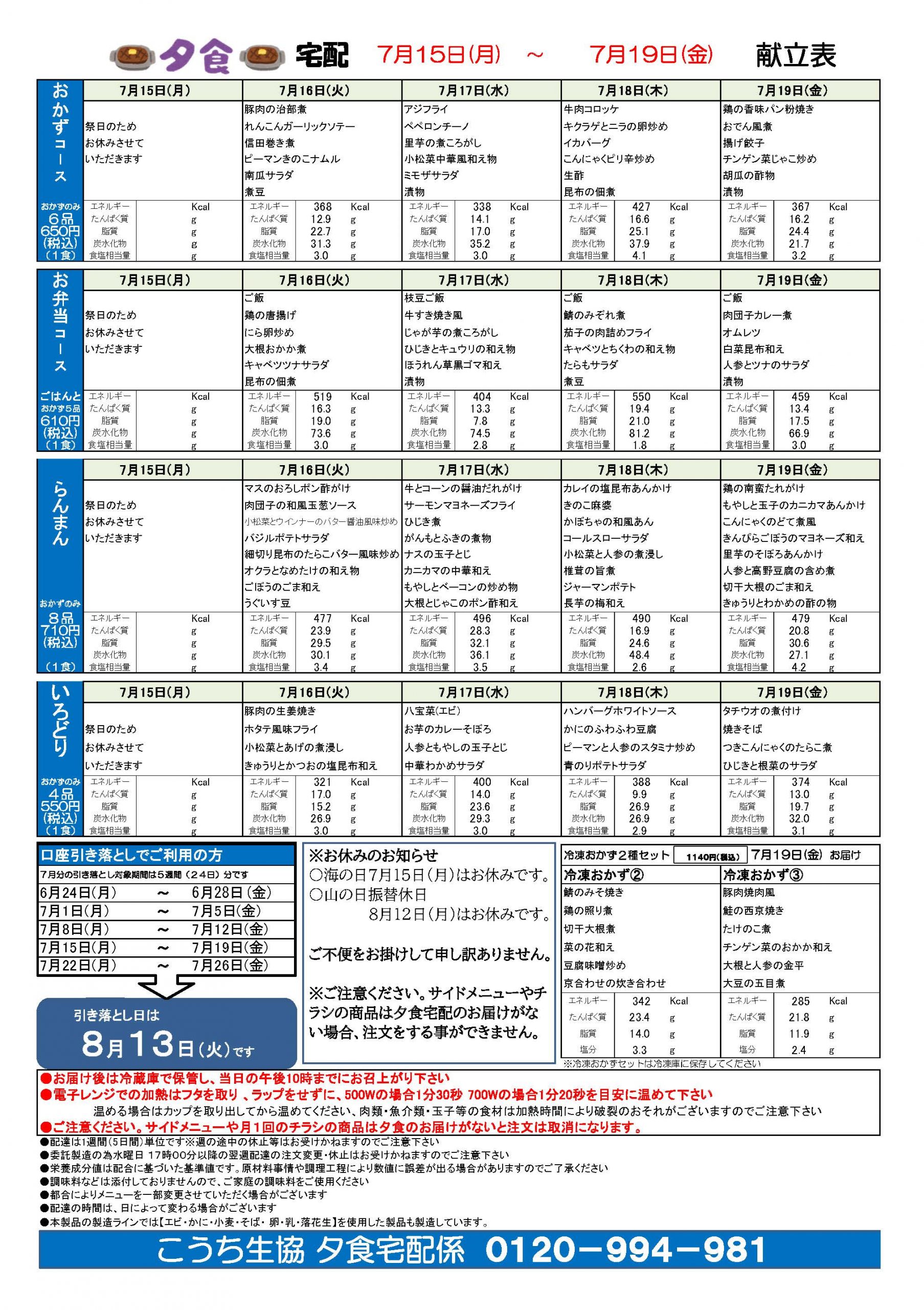 夕食宅配メニュー表(7月15日~7月19日)2024.07.03