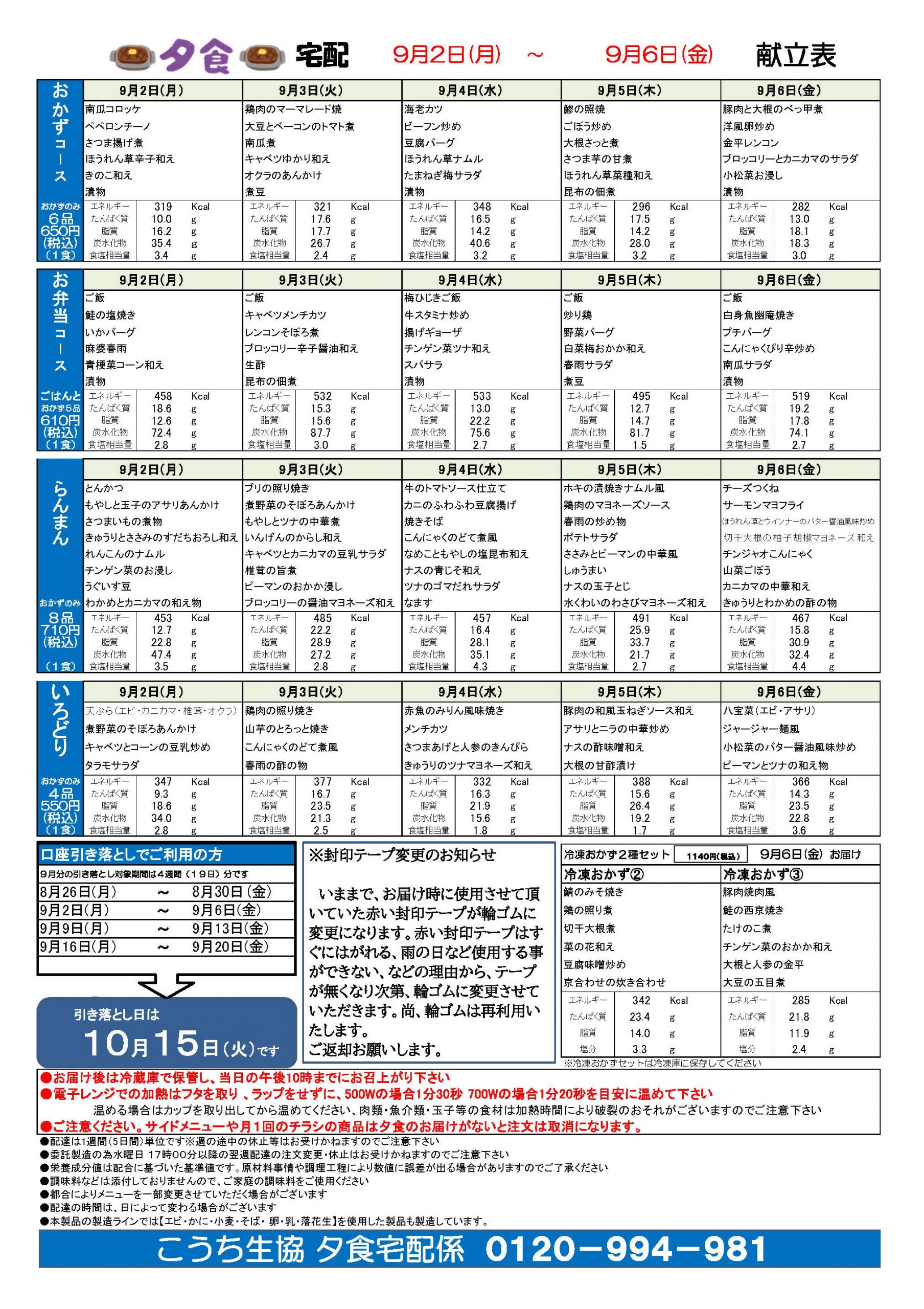 夕食宅配メニュー表(9月2日~9月6日)2024.08.27