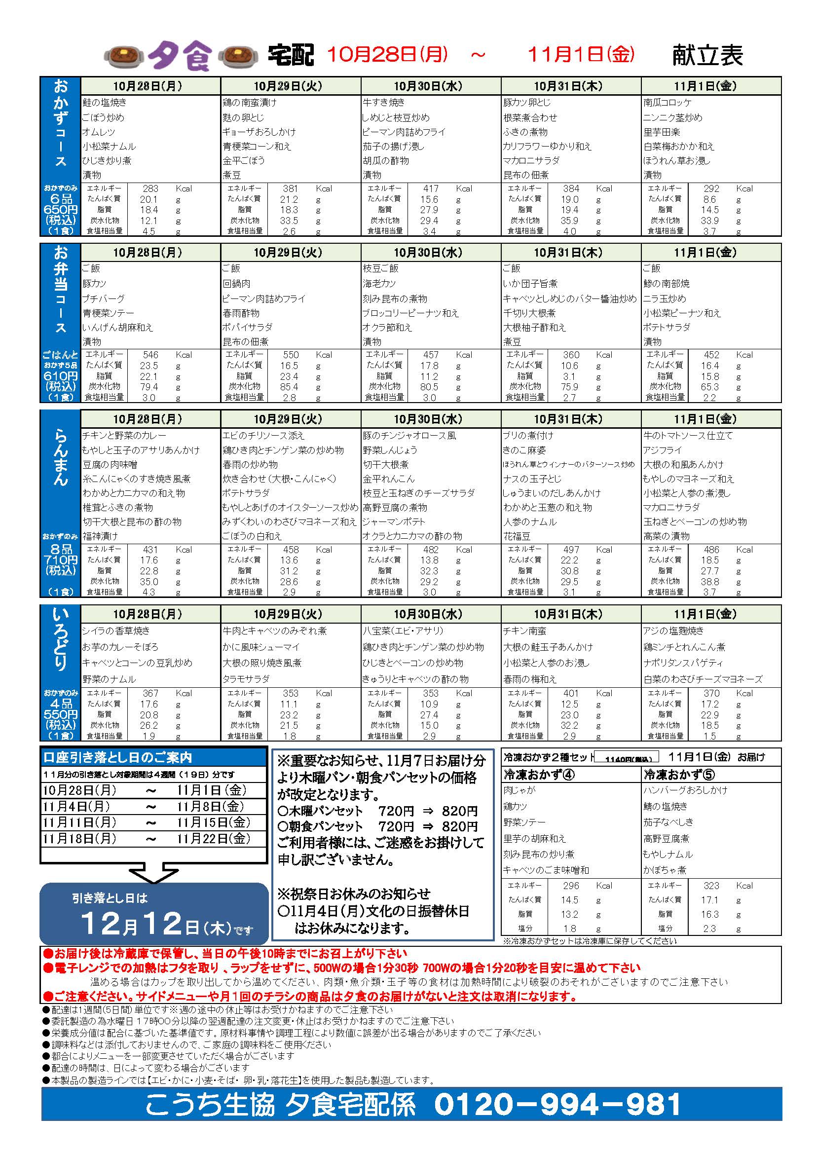 夕食宅配メニュー表(10月28日~11月1日)2024.10.15