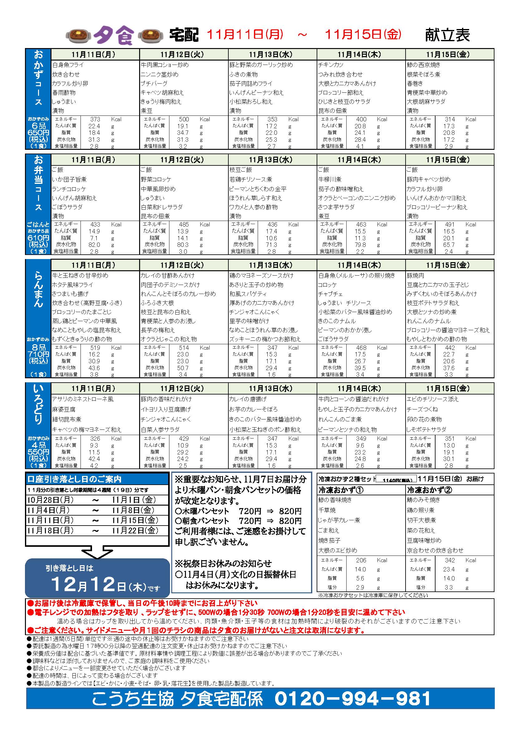 夕食宅配メニュー表(11月11日~11月15日)2024.10.29