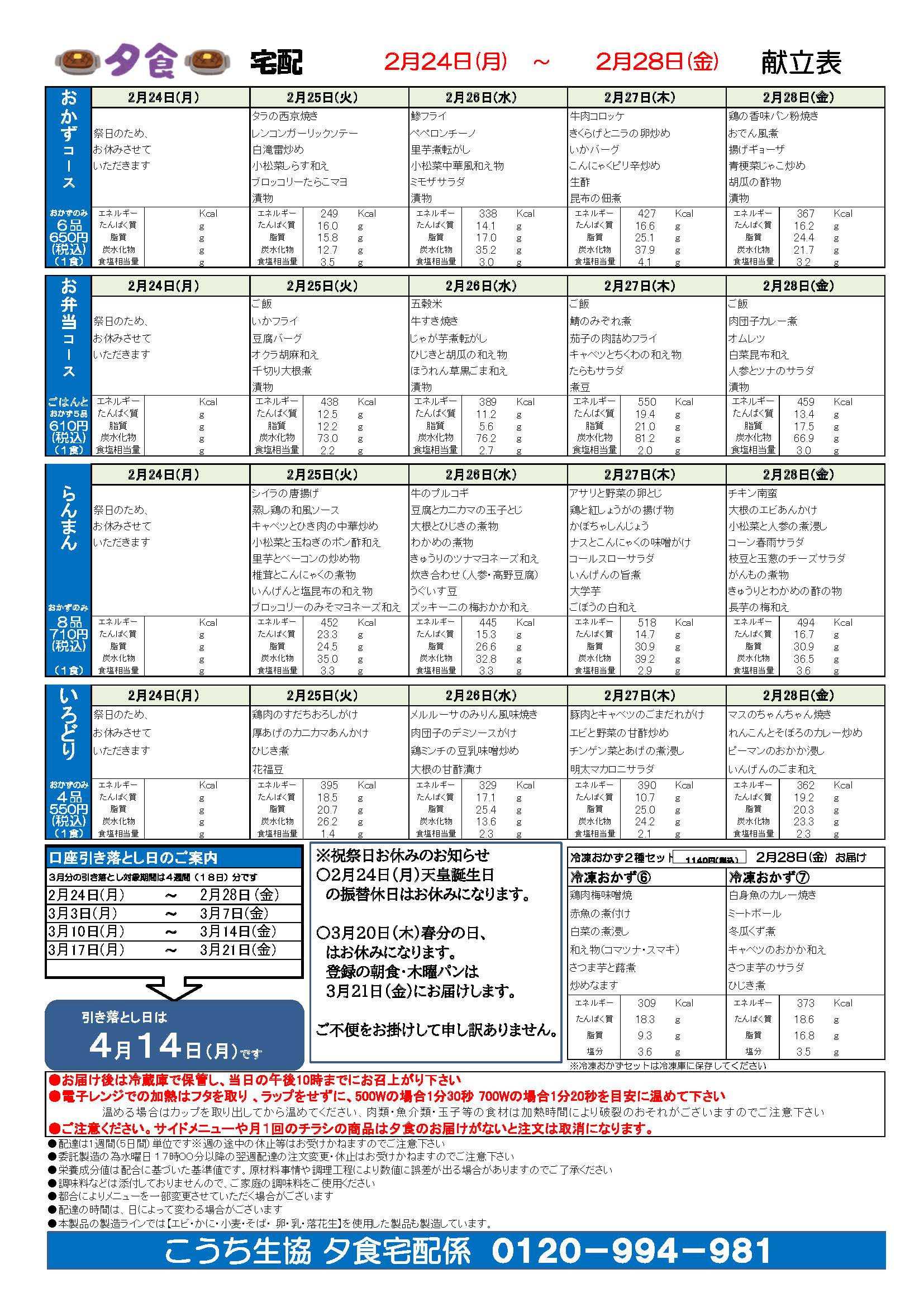 夕食宅配メニュー表(2月24日~2月28日)2025.02.13