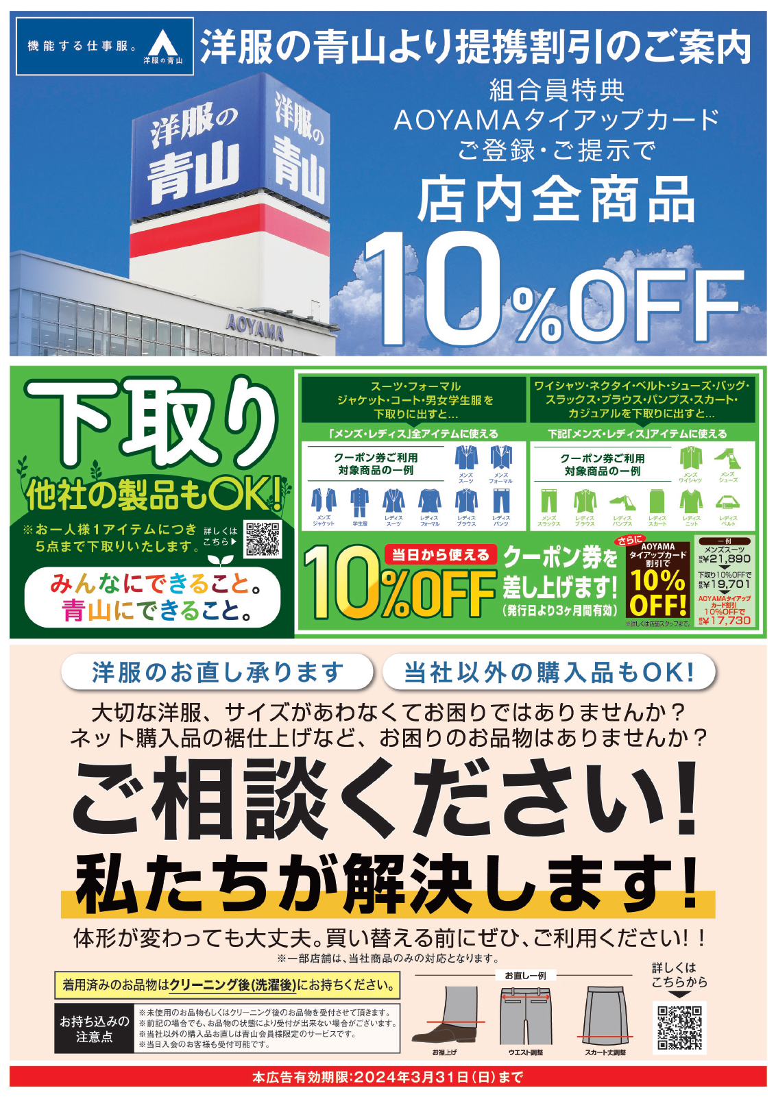 下記チラシのクーポンをご利用の際は、この画面を印刷もしくはスマートフォン等で画像を保存し、洋服の青山店舗のレジでご提示ください。